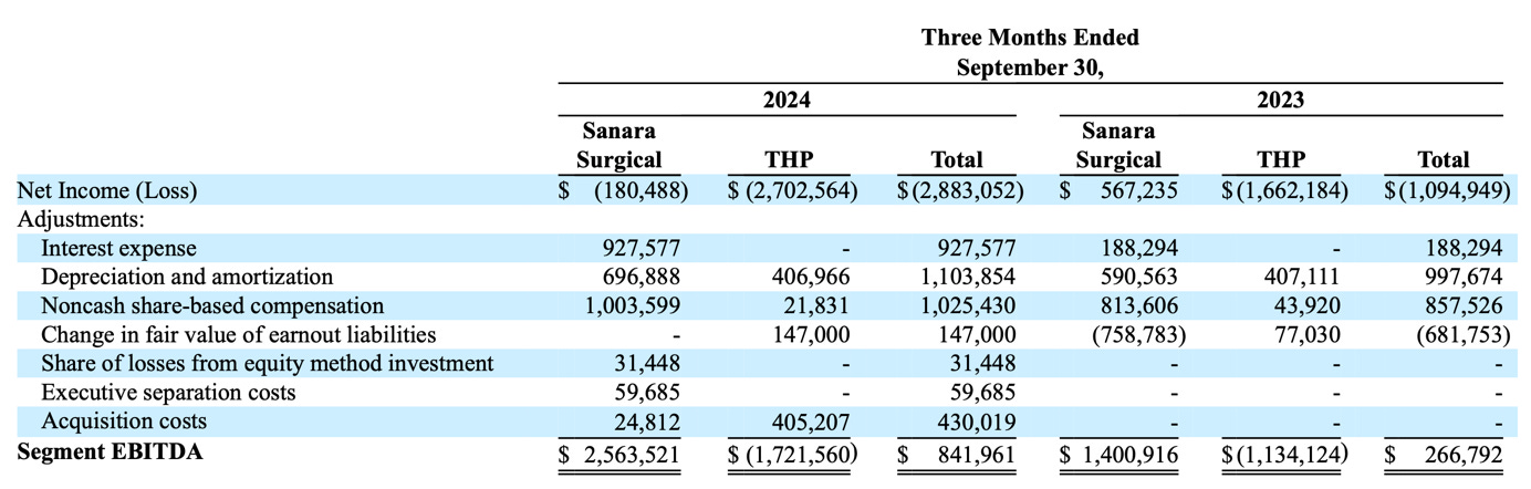 Let’s dive a bit deeper. If you look at the underlying economics, you’ll see that Sanara is choosing to be unprofitable. Below is the segmented economics for Sanara. Surgical, which is the only segment producing revenue for the company, is EBITDA positive. In fact, from 3Q23 to 3Q24 EBITDA increased 83%. Revenue in that same time period increased 35%. Did someone say operating leverage?